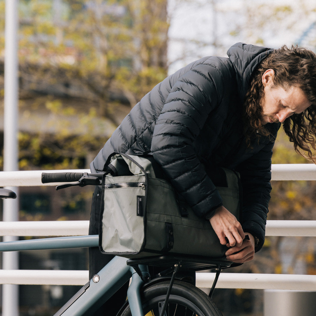 Die Helmsman ist nicht nur eine ideale Reisetasche, sondern lässt sich auch leicht an den vorderen Fahrradgepäckträgern befestigen und ist somit ein idealer Begleiter bei schlechtem Wetter.