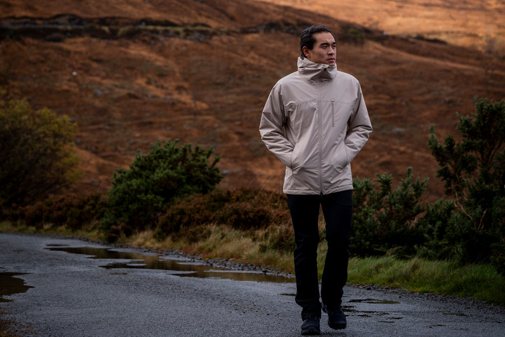 Das 3-lagige Außenmaterial ist vollständig nahtversiegelt und verfügt über eine Membrane, die aktiv Dampf entweichen lässt, während sie Regen abhält und in Synergie mit der PrimaLoft-Isolierung zur Regulierung der Körpertemperatur beiträgt. Das Außenmaterial ist mit einem umweltfreundlichen C0 DWR (durable water repellent) behandelt, um den Regen abzuweisen.