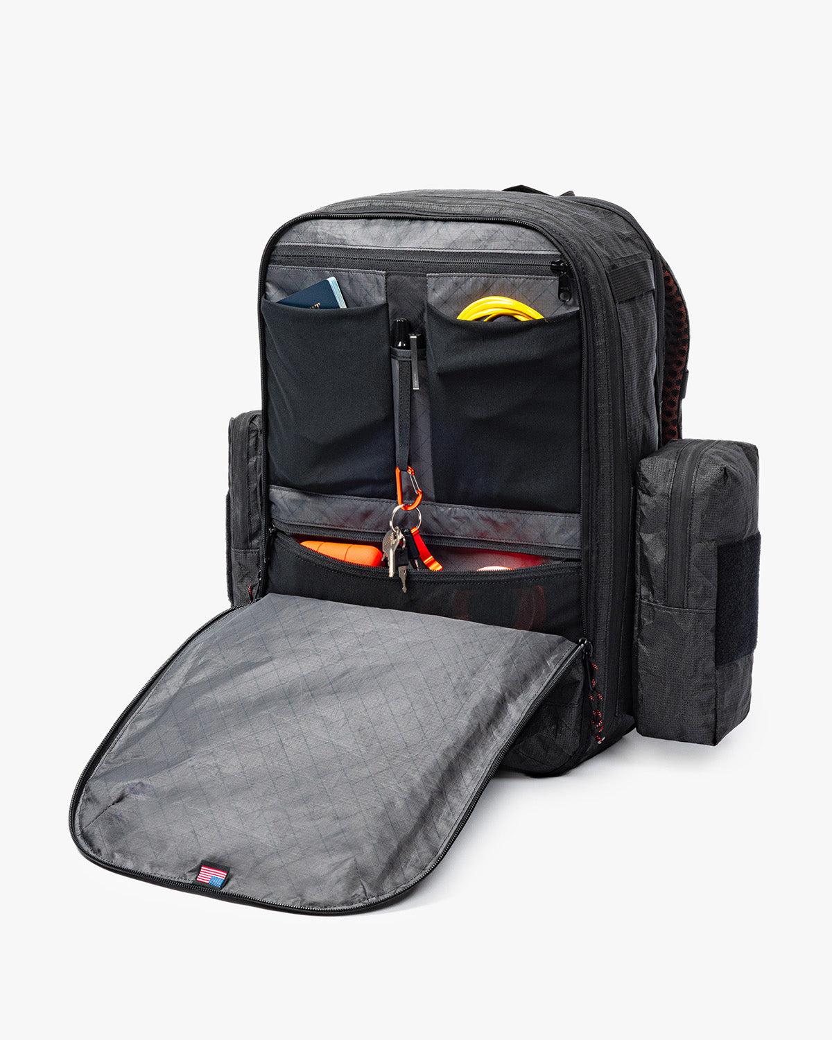 The full clamshell opening simplifies packing of the main compartment, and a dedicated tech compartment with organizer pockets and a carabiner clip secures keys and other daily essentials. A dual-access front admin panel with vertical external zippers provides immediate access to travel documents, AirPods, sunglasses, and other everyday carry items. Additionally, a top-access, rear-mounted, padded laptop sleeve offers easy access and protection from physical damage and weather. Featuring US made mil-spec, matte finish YKK Aquaguard zippers throughout.