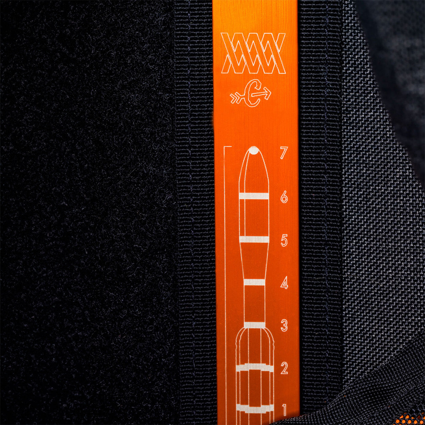 Hergestellt aus 6061-T6-Aluminium in Luft- und Raumfahrtqualität für Stabilität und geringes Gewicht. Kundenspezifische lasergravierte Collab-Grafiken und spezielle orangefarbene Eloxierung.