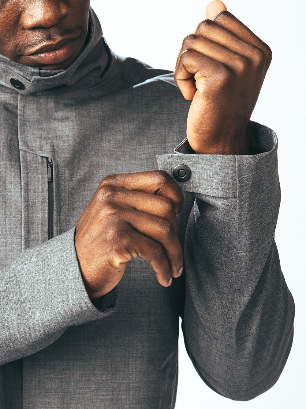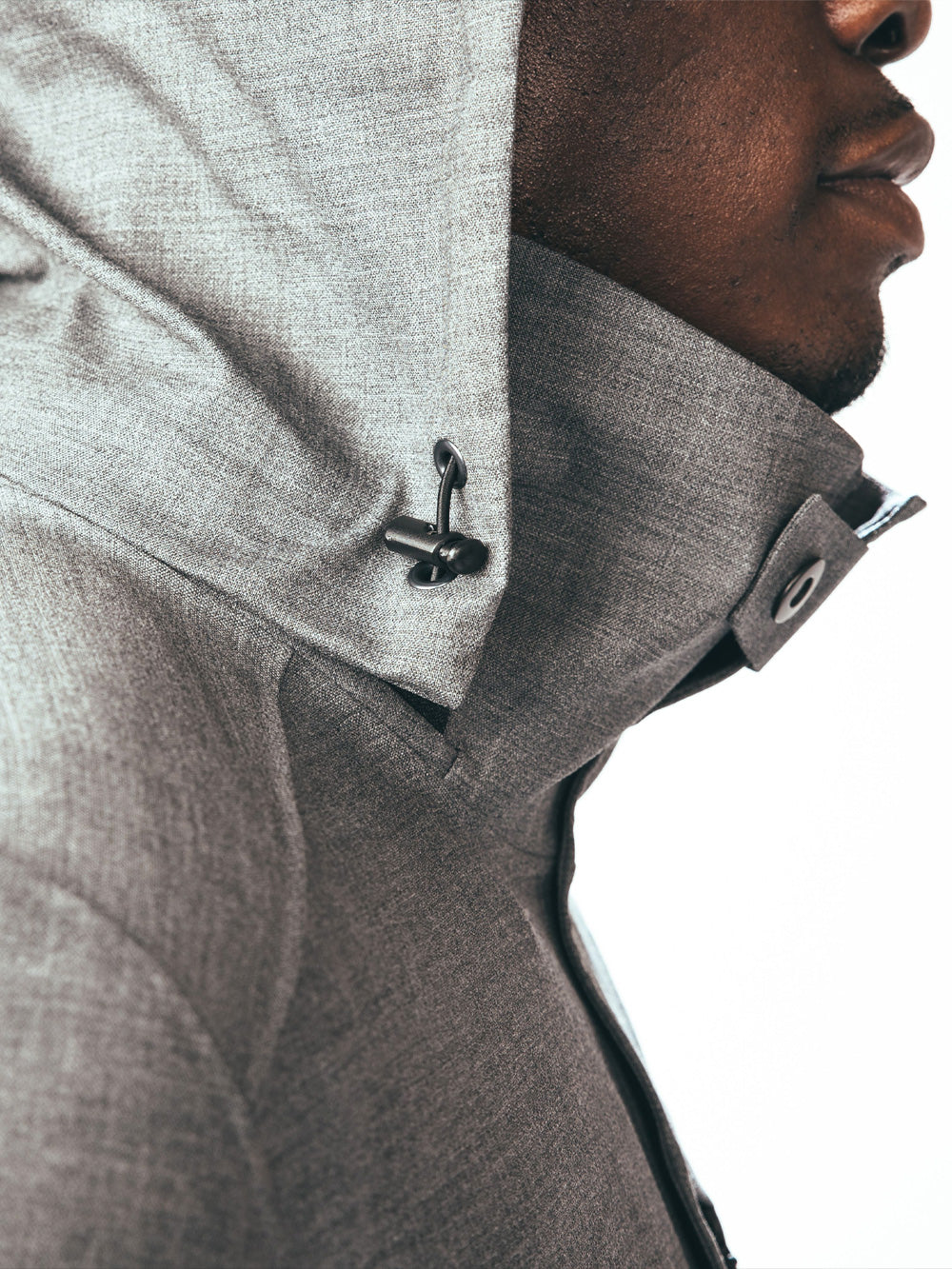 Die anthrazitfarbenen, grauen und hellgrauen Versionen des Styrman werden aus Schoeller® c_change®-Gewebe mit einer glatten, klassischen Wolloberfläche hergestellt. Die marineblaue Version besteht aus dem italienischen Como-Gewebe mit einer raffinierten, leicht strukturierten Wolloberfläche.